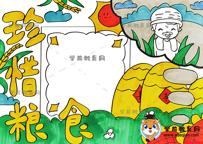 1、首先在左侧写上“珍惜粮食”当标题,可以把标题画的可爱一点,多看一些可爱的文字素材,这样的标题才更好看。