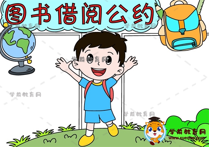 1、首先在手抄报画面顶部左上角写出“图书借阅公约”的标题文字,并在手抄报画面顶部画出书包和地球仪等图案。